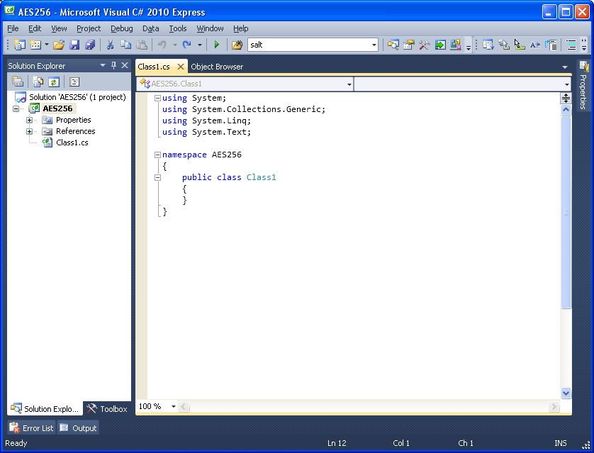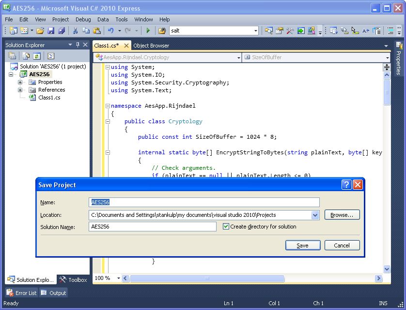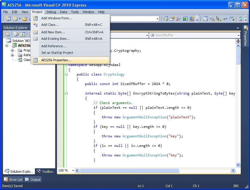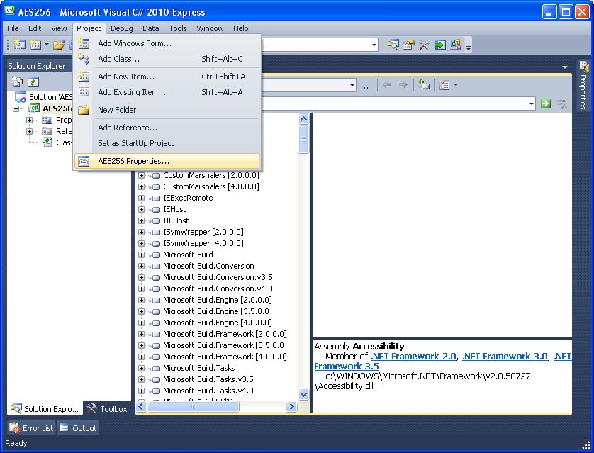 Create a new C# class library project named 'AES256' in MS Visual C# 2010 Express (downloadable at http://go.microsoft.com/?linkid=9709939), MS Visual Studio 2012 Express (downloadable at http://www.microsoft.com/en-us/download/confirmation.aspx?id=34673), SharpDevlop 4.4 (Downloadable from http://www.icsharpcode.net/OpenSource/SD/Download/GetFile.aspx?What=Setup&Release=Mirador), or any other appropriate programming environment.