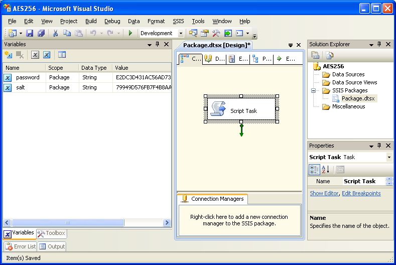 13. Add "password" and "salt" variables to the SSIS package