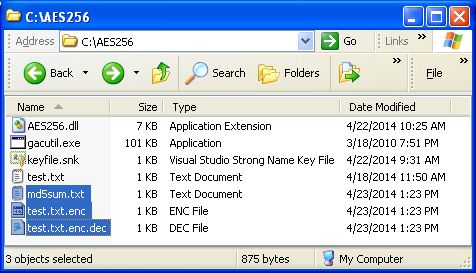 Browse to the C:\AES256\ folder to confirm that the encrypted file, the file containing the md5sum of the encrypted file, and the decrypted file have been created.