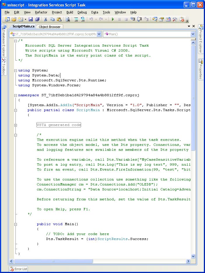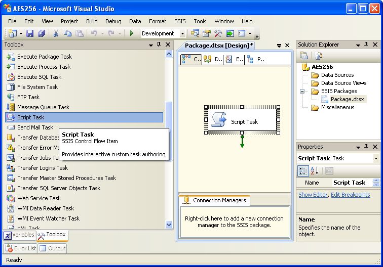 Drag-and-drop a script task onto the control flow panel of the default SSIS package.