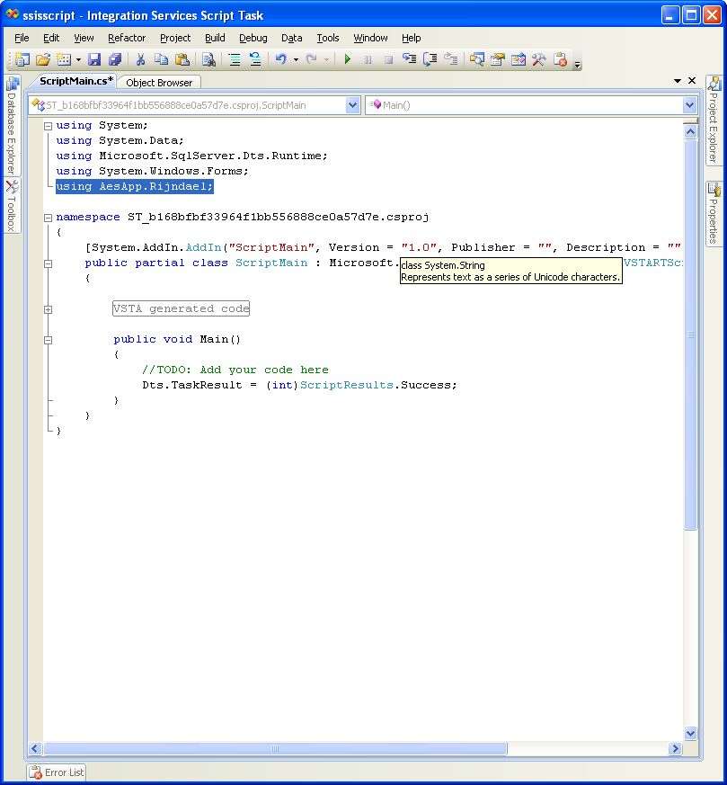 15. Add a "using" reference to the AesApp.Rijndael namespace of the AES256 assembly in the script task