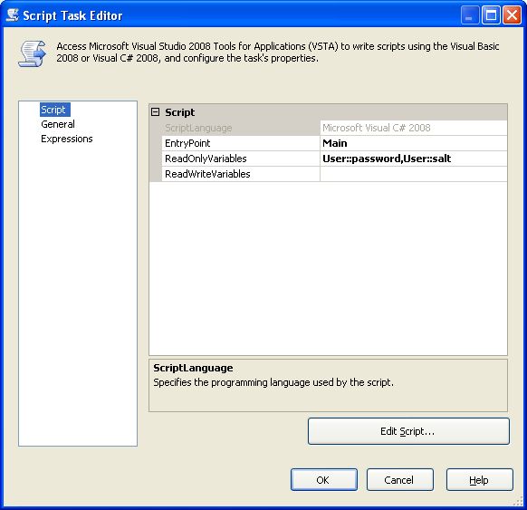 Double-click on the script task component to bring up the Script Task Editor. Add the read-only variables "User::password" and "User::salt" and then click on the Edit Script button...