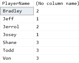 INSERT Player VALUES ('Shaquil', 1), ('Von', 1), ('Bradley', 1), ('Shane', 2), ('Todd', 2), ('Jerrol', 3), ('Jeff', 3), ('Josey', 3)