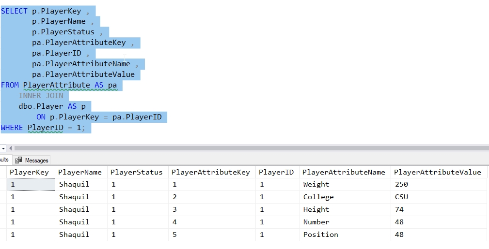 The setup script is shown below, and populates a few tables with information. There is a Player table and an EAV table called PlayerAttribute. I'll populate each with some data.
