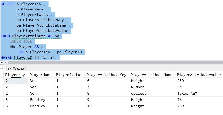 That's a report I can give to a business person to use in their data correction efforts. Note that I've got 2 values for Bradley (PlayerKey = 3) and one value for Jeff (PlayerKey = 7). This matches the report in the previous section.