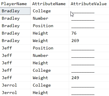 In my query, I'll use COALESCE() to return a string of underscores for missing values. I do this as the values I'm missing will come up as NULLs. One other important point, I need to get the player and the attribute name from my full list (the CTE), as the PlayerAttributeName from the PlayerAttribute table will return as NULL for missing values.