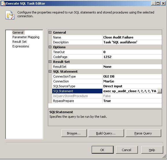 At the beginning of every package the procedure SP_Audit_Open is called via SQLTask. The procedure opens one audit with all already known information. Then it returns the ID of the audit-record. This ID has to be asserted to a variable in the package.