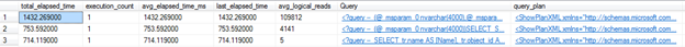 Notice that two columns in the result set appear like hyperlinks. The values in these columns are clickable. When clicked, the value will open a new query tab in management studio with either the Query (formatted for readability) or the graphical execution plan – depending on which column value is clicked. I use the Query link to help determine the correct query, and then select the query_plan that is associated to that query.