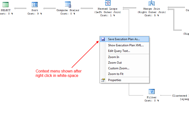 Notice that in this case, the new tab is labeled as ExecutionPlan2.sqlplan. It just so happens that the file extension for an exported execution plan is sqlplan. This indicates that we are pretty much ready to export the execution plan. Now one just need right-click somewhere in the whitespace of the graphical execution plan (anywhere in the plan that does not contain an image or text of some sort), to get the context menu displayed in the following.