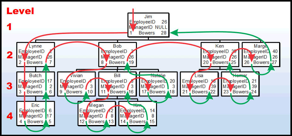 Before we start on the new process for converting an Adjacency List to Nested Sets, let me show you the traditional method also known as the "Push-Stack" method. It's very procedural (RBAR1 on steroids). Here's what it looks like when plotted against the org chart.
