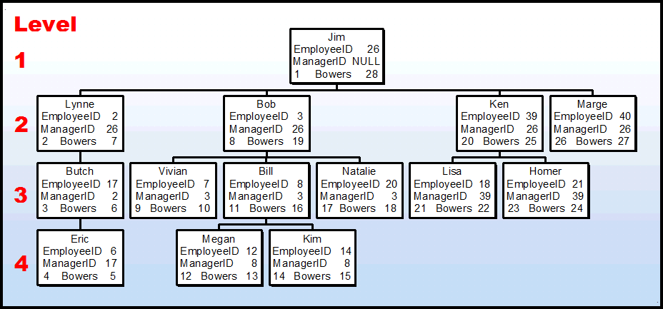 Each node has 4 lines of data in it (a total of 5 columns of information). The first 3 items below are included in the build by the "dbo.BuildSmallEmployeeTable" stored procedure.
