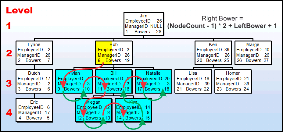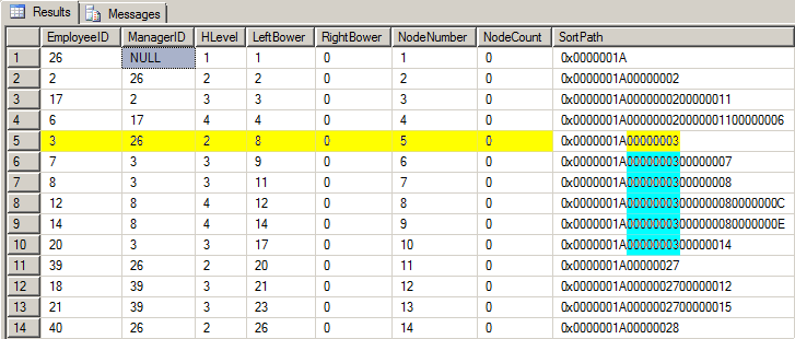 - As we read the nodes in a given level, convert the EmployeeID to a Binary(4) and concatenate it with the parents in the previous level's binary string of EmployeeID's. This will build the Sort Path.