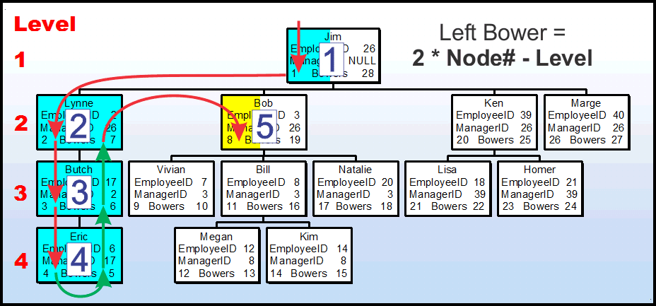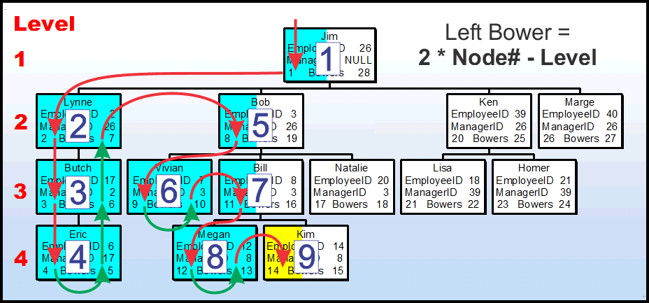 Using the same concept as we did with Bob, we've numbered the nodes in the order that they're first encountered by the push-stack method and have colored the nodes as to whether both Bowers have been "touched" (fully colored box) or just one Bower has been "touched" (half colored box). Notice that we've only "touched" the Left Bower of every node in Kim's upline and that number of nodes is the same as the Level that Kim's node is at, which is "4". Kim's node number is "9" because it's the 9th node that would have been "touched" by the push-stack method.