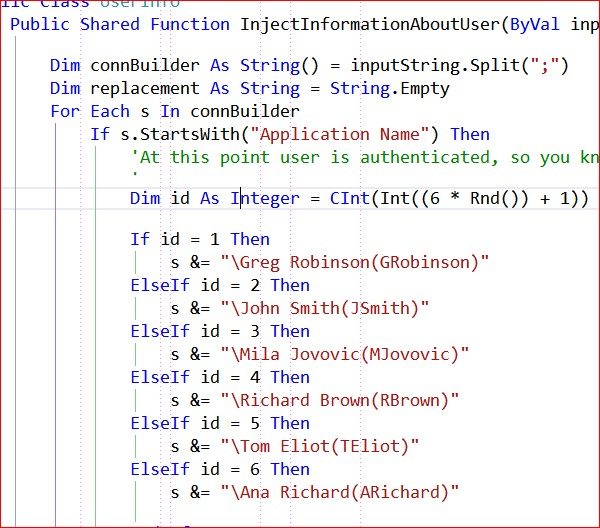 Normally, at this point the end-user of your application would be authenticated through the application, and we would know his name. Since in this test application we are not connecting through the real end-user application, we will generate a username and password randomly (using the code in the screenshot below) that will be stored in the audit table.