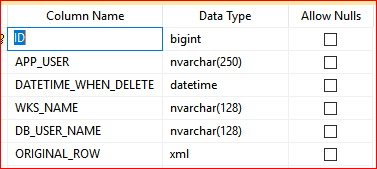 In addition to the "original" data from a particular record, we will also have descriptive part, which includes the time of deletion, application name with application user details (username, first name, last name), workstation, and database user name. You can see the table structure in the screenshot below: