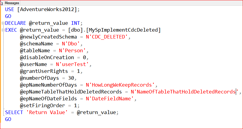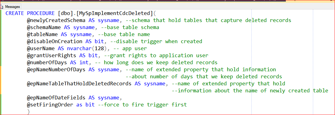 As we mentioned before, capturing deleted records over time can significantly increase the number of records stored in the CDC_DELETED database schema. Earlier I mentioned that we have defined an extended property where we define how many days we want to store deleted records for a particular table. Using this extended property and the stored procedure, MyPurgeDeletedRecords, we can purge deleted records. The complete code for this procedure is in "PurgeDeletedRecords.sql".