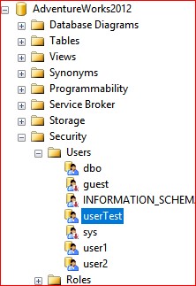 In this example, we will be using the database, AdventureWorks2012. I have created a user account, userTest, with the appropriate rights to the existing database schema. See the screenshot below.