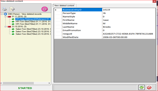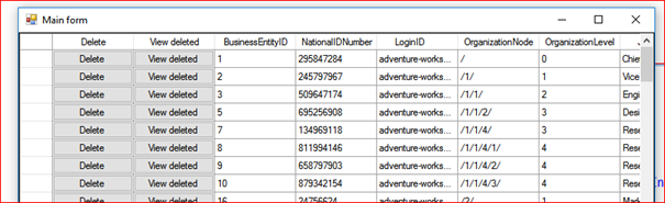 You can explore, and play with this small application. For instance, change the app.config entry for mainTableName from Person to SalesPerson, etc. On the left pane you see in form of tree view, deleted records grouped by date. On the right pane is showed content of deletion. Basic functionality is on top left pane. So, you can print, filter and start/stop capturing. In the three view there is a context menu, which enables you to expand/collapse all nodes. Nodes with a small red icon, should be considered container nodes. Nodes with a small green icon should be considered leaf nodes. When you click on each leaf node, a rebind occurrs in the right pane.