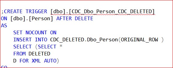 The records deleted from the table dbo.Person will be inserted into the table, CDC_DELETED.dbo_Person, in the CDC_DELETED database schema. Similarly, records deleted from dbo.SalesPerson will stream into CDC_DELETED.dbo_SalesPerson, and the corresponding table for dbo.Employee is CDC_DELETED.dbo_Employee. To do this, as I said, we will use a DML AFTER trigger, which will insert the original row in a field of type XML.