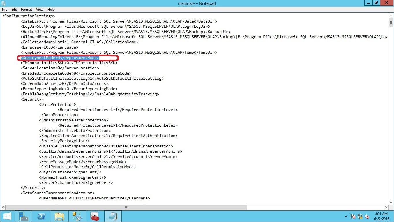 Open the config file in Notepad. Change the Deployment mode property from 0 (multidimensional) to 2 (tabular). In the below screenshot, the Deployment mode is set to 0 ( Multidimensional mode)
