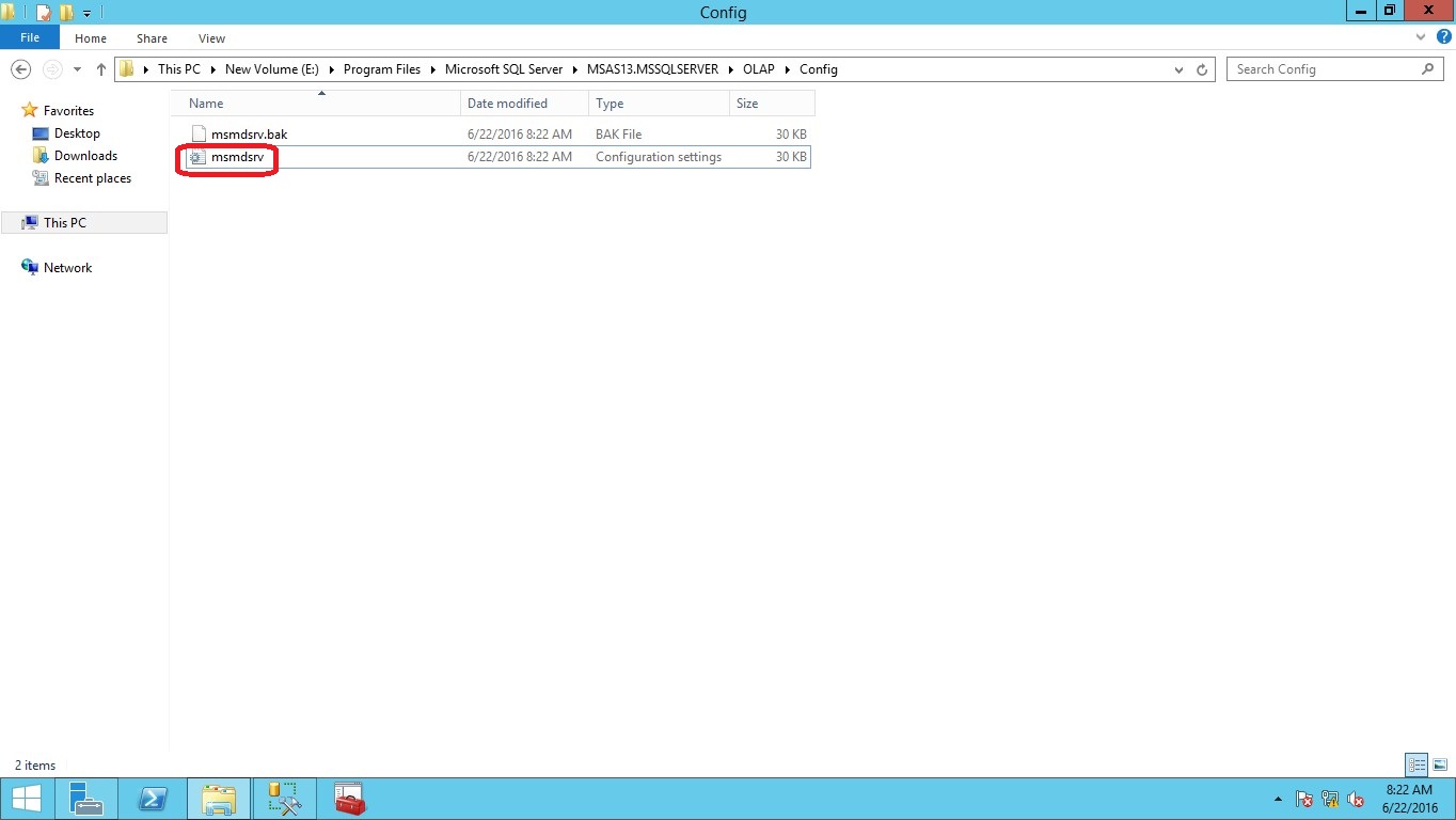 Traverse through the path C:\Program Files\Microsoft SQL Server\MSAS13.TABULAR\OLAP\Config and Copy the msmdsrv.ini file to your desktop as shown in below screenshot.