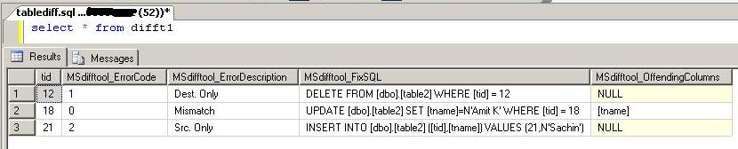 When -et parameter is used, the result table will be created in Destination Database. This table returns all rows where the data got mismatched based on primary (or Unique) Key including the script to resolve the conflict. It also returns all those rows which are only present at source or destination.