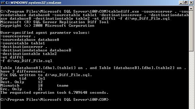 TableDiff.exe -SourceServer . -SourceDatabase DatabaseA -SourceTable Table1 -DestinationServer . -DestinationDatabase DatabaseB -DestinationTable Table2 -et difft1 -f d:\my_Diff_File.sql