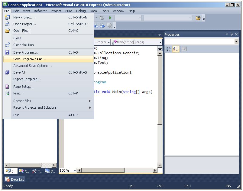 To give the project a meaningful name, click on File-SaveConsoleApplication1 As...