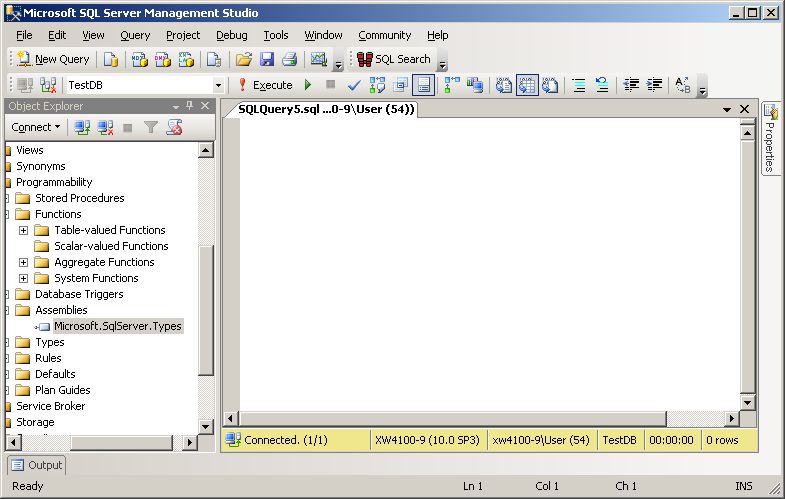 Browse to the TestDB-Programmability-Assemblies node and note that the only assembly available by default is Microsoft.SqlServer.Types.