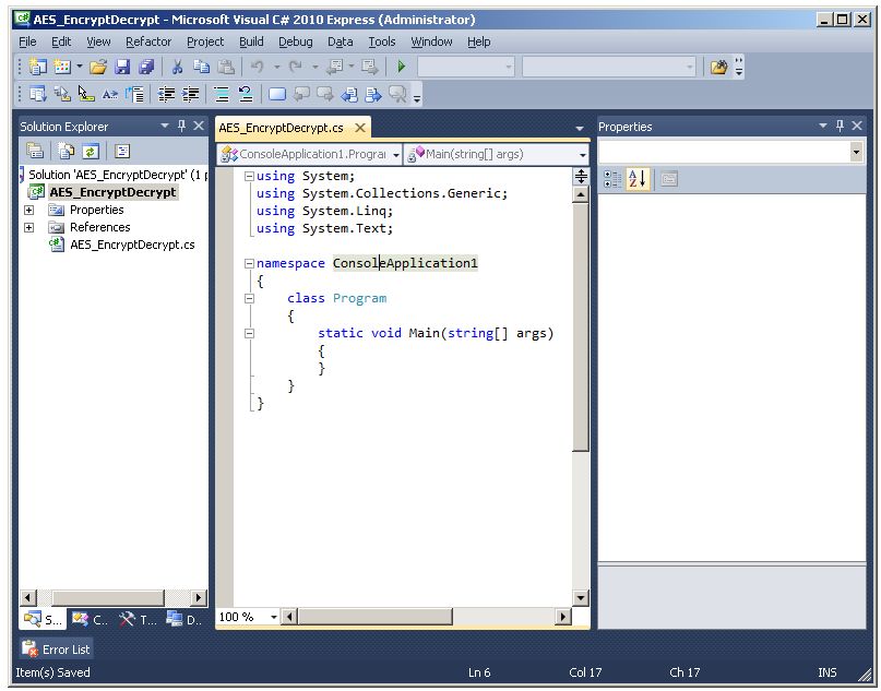 Copy the C# console application code in the text box at the top of this article and paste it over the template code in the AES_EncryptDecrypt.cs file.