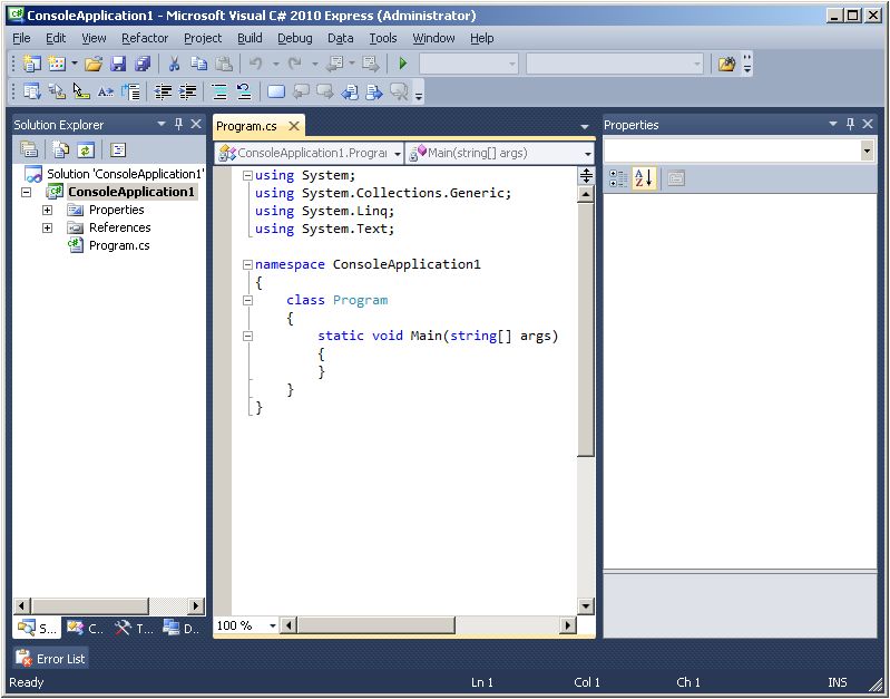 To compile and execute the code, create a new project in Microsoft Visual C# 2010 Express (downloadable at http://go.microsoft.com/?linkid=9709939).
