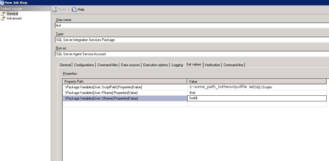 Once saved and compiled\built, the package may either be uploaded to a SQL Server instance or stored on the NTFS file system. I've stored mine in SQL Server and configured my SQL Server agent job as shown in Diagram 10. Notice the new values I've passed to the variables.