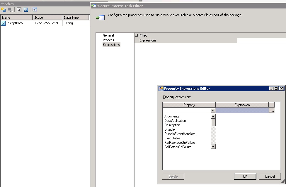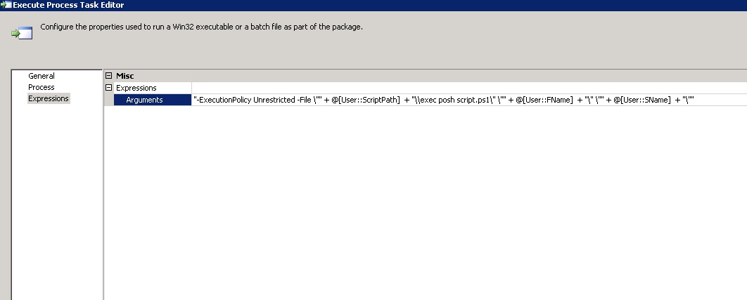 "-ExecutionPolicy Unrestricted -File "" + @[User::ScriptPath] + "\exec posh script.ps1" "" + @[User::FName] + "" "" + @[User::SName] + """