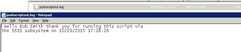 #declare calling params param( [string] $Firstname, [string] $Surname ) #end calling params #main body #Get the current date $rundate = Get-Date -displayhint date #Now write a message Write-Output " Hello $($Firstname) $($Surname) thank you for running this script via`r`nthe SSIS subsystem on $($rundate)" | out-file -filepath "C:\support\poshscriptout.log"