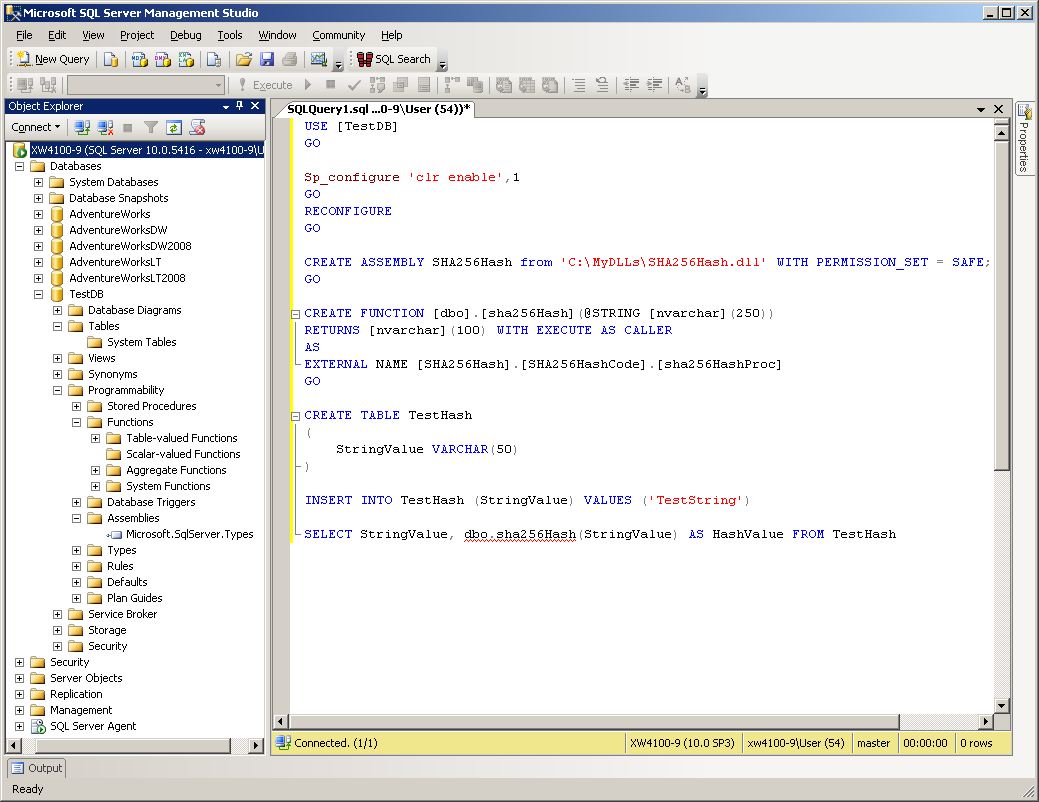 SELECT StringValue, dbo.sha256Hash(StringValue) AS HashValue FROM TestHash...into the query editor window.