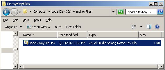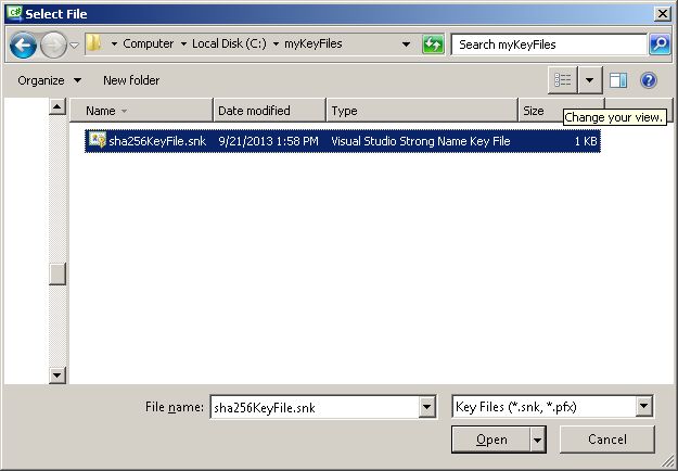 Browse to the C:\myKeyFiles\ directory and select the sha256KeyFile.snk file that we created earlier.