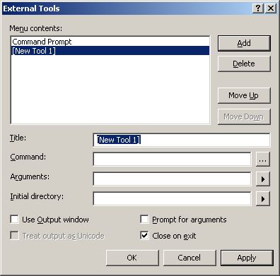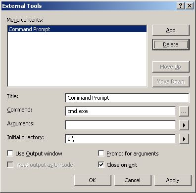Enter the title Command Prompt, the command cmd.exe and the initial directory c:\, then click the Add button to add the Command Prompt to the Tools menu.