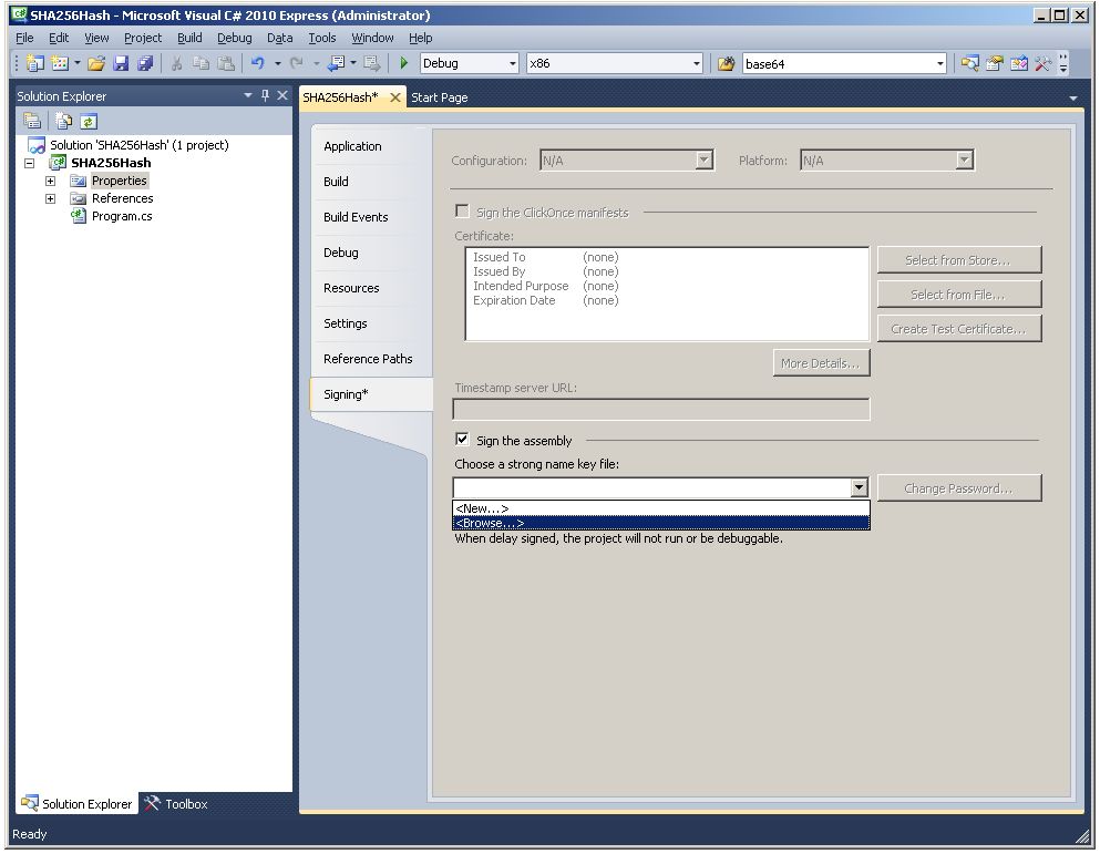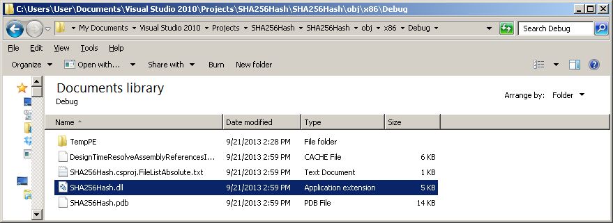 Now browse to the SHA256 project and drill down to the ..\x86\Debug\ folder where the newly created CLR assembly SHA256Hash.dll resides.