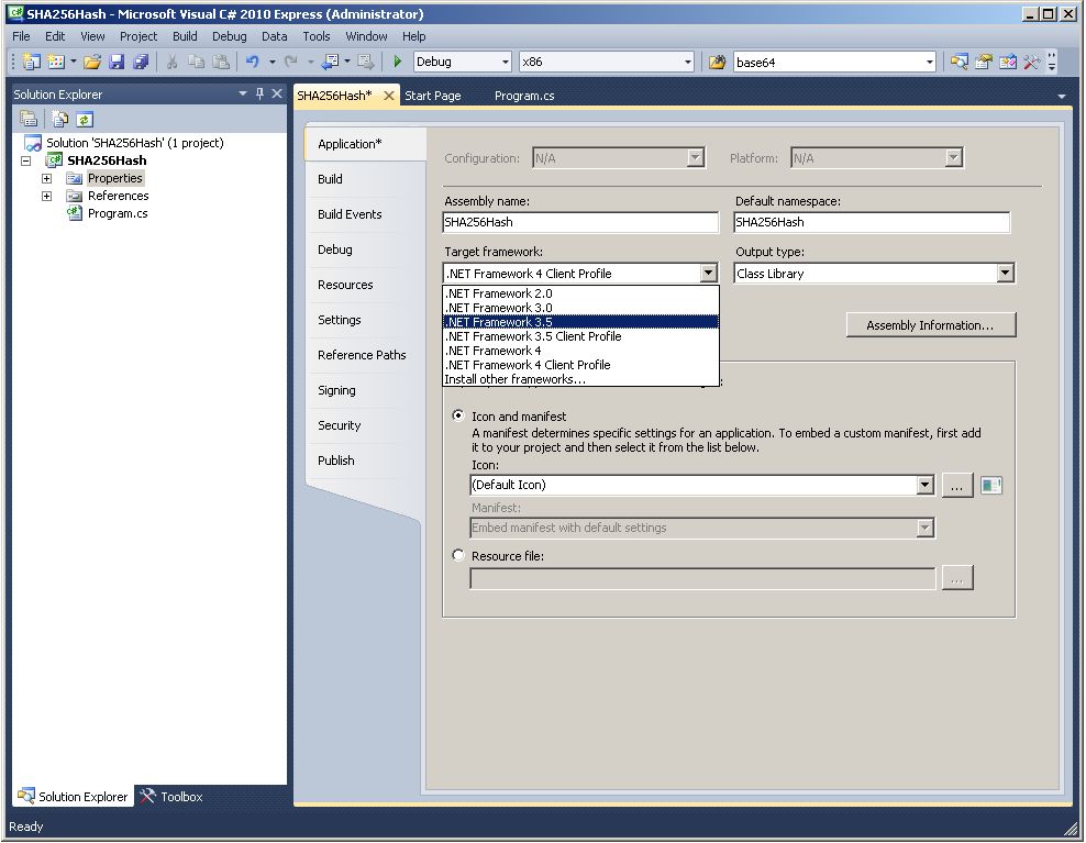 To deploy our SHA-256 code to SQL Server 2005/2008 as a CLR assembly we need to change the output type from Console Application to Class Library, change the target .NET framework to .NET 3.5 (.NET 4 is supported by SQL Server 2012, but not by earlier versions of SQL Server), and sign the compiled assembly with a strong name.