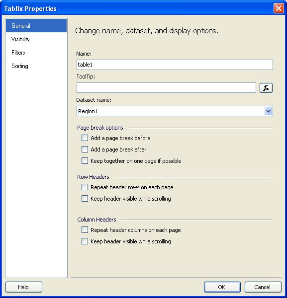 In order to get to the PageName attribute, click on Row Groups/table1_Details_Group and expand the Group attribute in the Tablix Member Properties dialog box. The PageName attribute is on the lower righthand side. Enter the desired name of the sheet in the PageName attribute field.