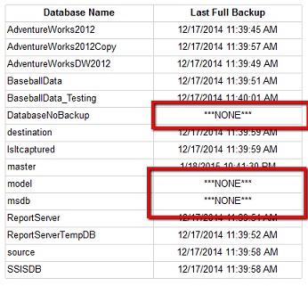 SELECT d.name AS DatabaseName ,MAX(b.backup_finish_date) AS last_full_backup FROM sys.databases AS d LEFT OUTER JOIN msdb.dbo.backupset AS b ON b.database_name = d.NAME WHERE d.name <> 'tempdb' AND b.type = 'D' GROUP BY d.name UNION SELECT d.name AS DatabaseName ,NULL AS last_full_backup FROM master.dbo.sysdatabases AS d LEFT JOIN msdb.dbo.backupset AS b ON b.database_name = d.name WHERE b.database_name IS NULL AND d.name <> 'tempdb' ORDER BY d.name