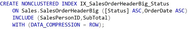 There also may be a few comments about my DATA_COMPRESSION = ROW parameter in the definition of the three indexes. In my experience and from my blog on data compression (https://logicalread.com/sql-server-index-compression-mb01/#.XFc0UPZFxPY) there are many benefits and almost no cons for using row data compression since data is compressed all the way from the hard drive to the buffer cache to the L3 processor cache and finally compressed/decompressed at the L2 cache of the processor. Data compression has been available from SS2008 Enterprise Edition and now available from SS2016 SP2 Standard Edition on.