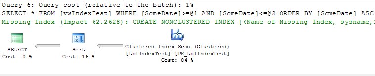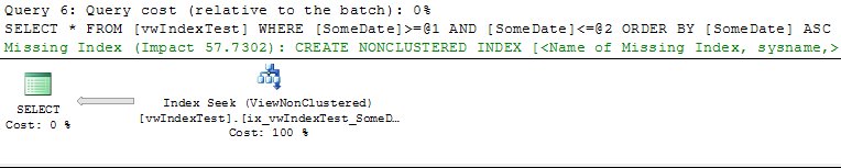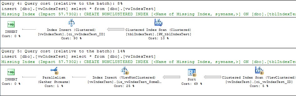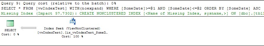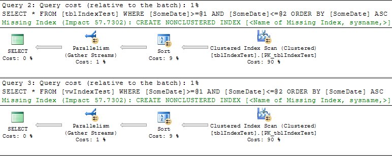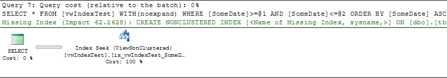 -- Create Indexes CREATE UNIQUE CLUSTERED INDEX [ci_vwIndexTest_ID] ON [dbo].[vwIndexTest] ( [ID] ASC )WITH (PAD_INDEX = OFF, STATISTICS_NORECOMPUTE = OFF, SORT_IN_TEMPDB = OFF, IGNORE_DUP_KEY = OFF, DROP_EXISTING = OFF, ONLINE = OFF, ALLOW_ROW_LOCKS = ON, ALLOW_PAGE_LOCKS = ON) ON [PRIMARY] GO CREATE NONCLUSTERED INDEX [ix_vwIndexTest_SomeDate] ON [dbo].[vwIndexTest] ( [SomeDate] ASC ) INCLUDE ( [ID], [SomeText]) WITH (PAD_INDEX = OFF, STATISTICS_NORECOMPUTE = OFF, SORT_IN_TEMPDB = OFF, DROP_EXISTING = OFF, ONLINE = OFF, ALLOW_ROW_LOCKS = ON, ALLOW_PAGE_LOCKS = ON) ON [PRIMARY] GO