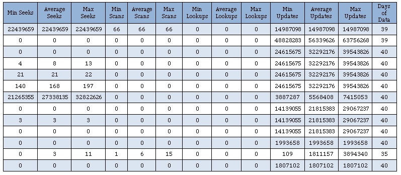 The table below is an abbreviated listing of the collected index utilization statistics (I've removed the identifiable names to protect the guilty) the data speaks for itself: