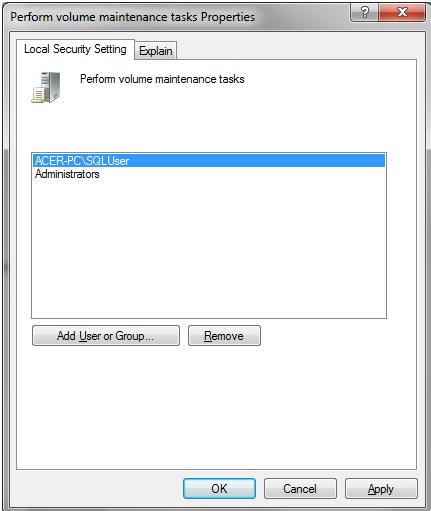 Enabling Instant File Initialization is a quite simple. In Windows Server 2003 & above we have a security policy known as “Perform Volume Maintenance Tasks”. To enable the Instant File Initialization in our environment, we need to give permission to our SQL Server Service Account to this security policy.
