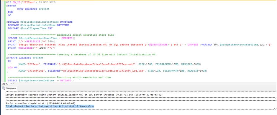This time it took only 13 seconds to create the same database with same size. Enabling IFI reduced the processing time by 90% in this case. In general the amount of time IFI will reduce mostly depends on the size of the data file it is working upon.