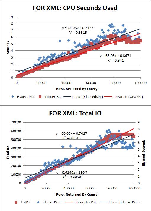 Also, I left out the memory chart deliberately, as it was flat and very low. FOR XML appears to be very memory efficient (I should mention that between tests I'm performing a DBCC DROPCLEANBUFFERS to clear cache as much as possible to a pristine state before starting the next test).