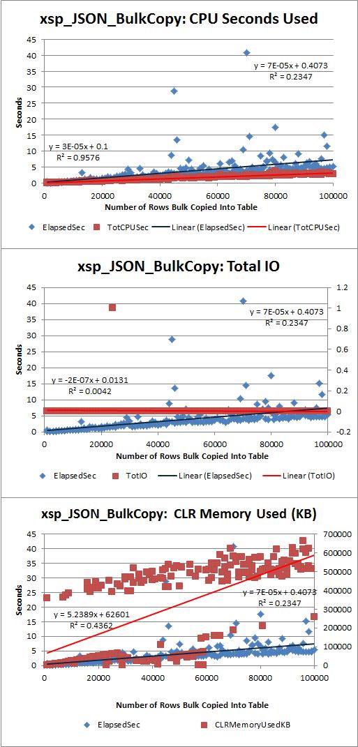 I ran several iterations of tests, measuring serialization and deserialization of JSON vs XML on two 100K row tables, one narrow with mostly numeric data, and the other wide with mostly textual data, in increments of 1000 rows per run. I checked CPU, IO, and memory usage, both SQL and CLR memory used. I also ran both forwards-allocation and a backwards-allocation iterations: in other words, I ran up the number of records in 1000 row batches both up --1000, 2000, 3000, etc. -- and back down --- 100,000, then 99,000, then 98,000, etc. This allows us to consider garbage collection and dynamic memory management efficiency on the process: how quickly does CLR release memory back to the OS? I also ran a third random-allocation iteration, where the test could execute over a random number of rows between 1000 and 100K, in multiples of 1000, to see how rowset volatility affected performance and resources. Testing was done on a server with other concurrent heavy workloads, in the form of interactive and ad hoc SQL, T-SQL and CLR procedures, SQL Agent jobs, and about 20 other databases present and active with appx. 100 concurrent user connections.