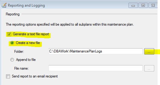 Generate a text file report and the option to Create a new file. When creating a new file SQL Server will default to the local host default log folder specified during the setup process. You can change this by clicking on the button with the elipses.