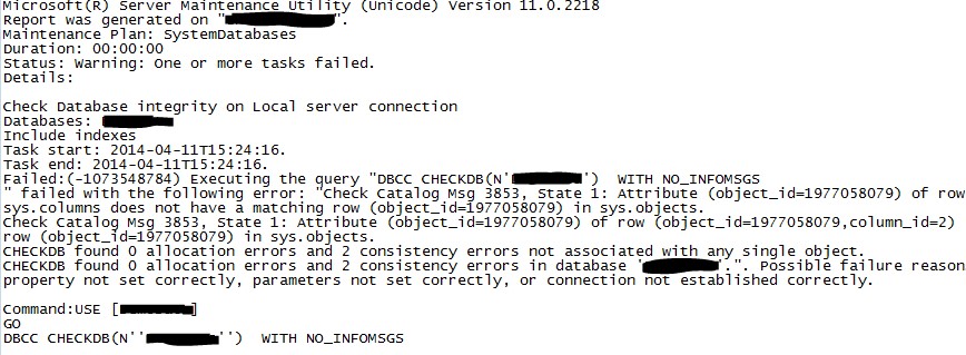 In this case, the log file from the Maintenance Plan displays the details of the Database Integrity Task, allowing you to better understand the issue.